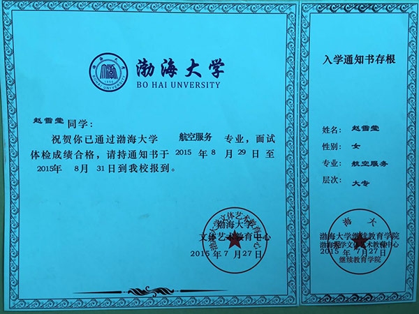 恭喜赵雪莹同学被我校录取【渤海大学航空】